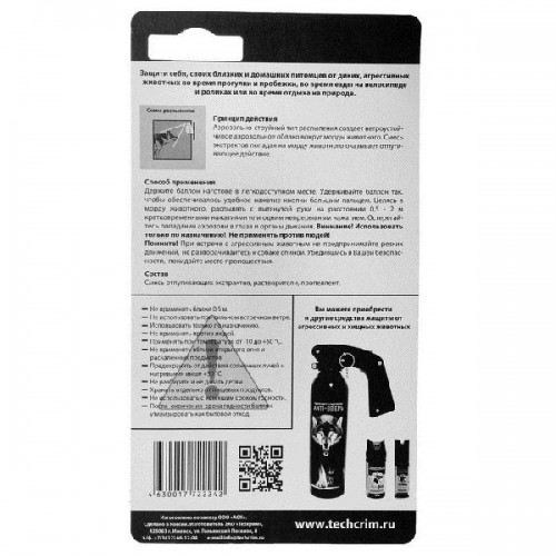 Позволяет защитить себя, своих близких и домашних питомцев от диких, агрессивных животных во время прогулки и пробежки, во время езды на велосипеде и роликах или во время отдыха на природе.