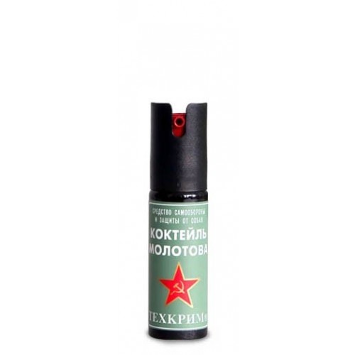 "Техкрим. Коктейль Молотова" 25 мл получил своё распространение, благодаря простоте его использования и достигаемого эффекта при защите от нападающих, доступности по цене и надёжности в применении. Его можно также использовать при защите от бездомных собак. Но есть и ряд противопоказаний для его применения. Так газовый баллончик нельзя применять в закрытых помещениях, в салонах автомобилей, при его применении необходимо учитывать направление ветра, чтобы не быть самому поражённым его содержимым. Он имеет алюминиевую оболочку объёмом 25 мл, и в нём содержится смесь МПК и СS. Действие данной смеси является слезоточивым. Так МПК вызывает раздражение слизистой оболочки глаз и дыхательных путей. При этом его действие сопровождается сильными выделениями слизистой оболочки. Характеристики баллончика позволяют применять его в разных климатических условиях, его можно использовать при температуре от - 10 до + 50°С. При применении баллончика «Коктейль Молотова» смертные случаи исключены. Время непрерывного использования – около 5 секунд. Принцип действия: аэрозольный, дальность эффективного применения: 5 метров.
