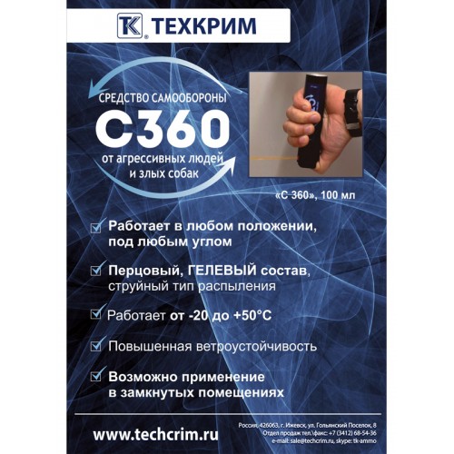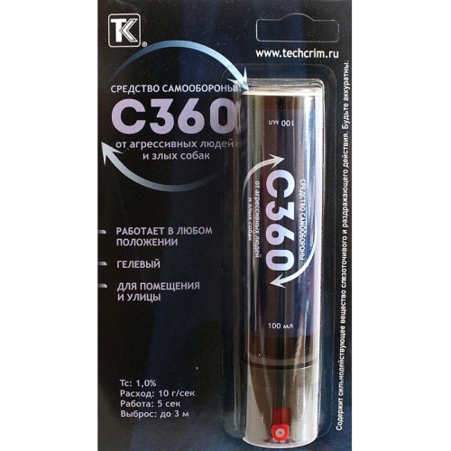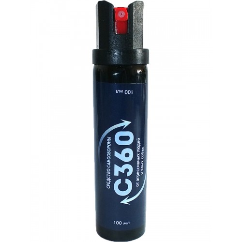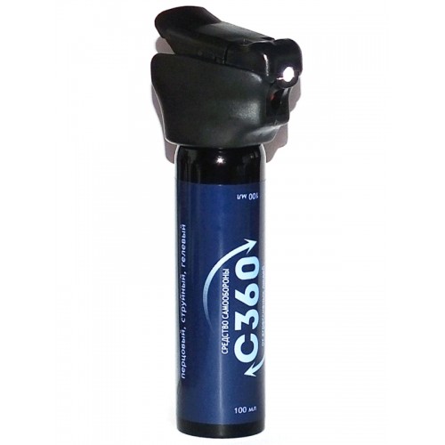Газовый баллончик С 360 работает в любом положении, под любым углом. Действующий состав эвакуируется в виде плотного геля. Гель залепляет глаза, дыхательные пути, а также затекает под очки. С 360 относится к баллончикам со струйным типом распыления, в результате чего его возможно использовать как на открытом воздухе, так и в замкнутом помещении. Имеет повышенную ветроустойчивость. Масса жидкого состава (в среднем): 50 г. слезоточивые вещества (ирританты): OC олеорезин капсикум 95% (экстракт натурального жгучего перца) Tc: 1,0%. Тип распыления: СГ (струйный гелевый). Эффективная дальность: 3 м. Время работы: 5 с (10 кратковременных нажатий). Рабочая температура: -20…+50°С. Срок годности: 3 года. Допускается применение в замкнутых помещениях и на открытом воздухе.