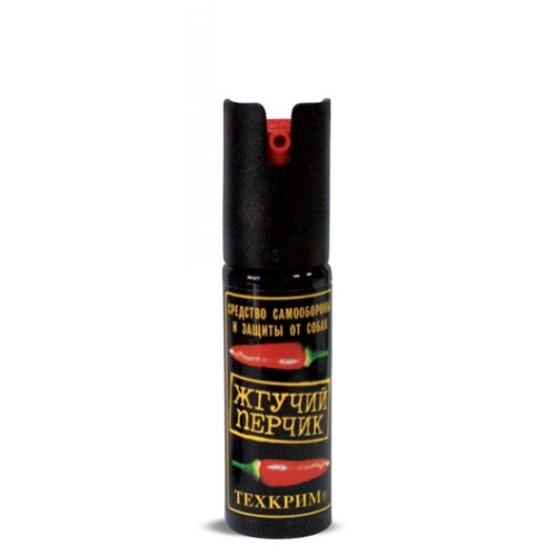 Техкрим Жгучий перчик 25 мл снаряжен популярным слезоточивым раздражающим веществом олеорезин капсикум (ОС) - экстракт натурального красного горького перца. Эффективность определяется используемым слезоточивым раздражающим веществом, его массой и концентрацией, дальностью и временем действия. Морфолид пеларгоновой кислоты (МПК) и олеорезин капсикум оказывают отпугивающее воздействие на собак. Вещество CS вызывает непереносимую боль в глазах, сильное слезоточивое действие, раздражение верхних дыхательных путей, жжение кожи лица. МПК оказывает воздействие на органы дыхания и сильное жжение кожи. Диаметр: 25 мм, высота: 98,5 мм. Масса жидкого состава (в среднем): 22 грамма. Тип распыления: А, пятно контакта на 1,5 метра: 40 сантиметров, эффективная дальность: 1,5 метра, время работы: 5 секунд (10 кратковременных нажатий). Рабочая температура: -10…+50°С. Рекомендуется применять на открытом воздухе.