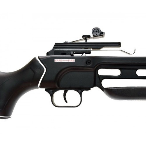 К примеру, приклад - из пластика, имеющий черный цвет. Плечи прибора - из композита с карбоновыми нитями, за счет чего они упруги и прочны и рассчитаны на количество выстрелов - больше 10000. Ствол выполнен из алюминия. В данной серии арбалетов эти изделия обладают очень легким весом и имеют массу всего 2500 гр при общих габаритах этой модели по длине - 860 мм, ширины - 680 мм. Так называемый боеприпас - стрела обладает длиной в 16 дюймов/ 44 см, диаметр которой - 9 мм. Тетива сделана из высокомолекулярного синтетического волокна с длительным сроком службы, прочного и износостойкого, рабочий ход которой равен 28 см. Изделие обладает стременным взводом, где стремя - неподвижно. Натяжение тетивы - легкое и будет удобным и для женщин, и для подростков.