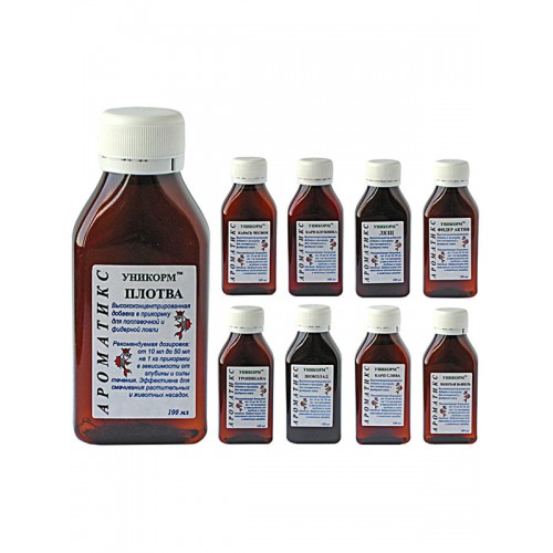 Технологический центр Sabaneev выпустил новую серию высококонцентрированных жидких вкусовых и ароматических добавок Уникорм Ароматикс. На данный момент серия состоит из девяти разновидностей добавок, расфасованных по 30 и 100 мл. Это: карп-клубника, карп-слива, лещ, плотва, карась-чеснок, шоколад, тропикана, золотая ваниль, фидер-актив. Рекомендуемая примерная дозировка: от 10 до 50 мл на 1 кг сухой прикормки (зависит от течения, глубины, температуры воды, активности рыбы). Наиболее универсальной из добавок является ванильная — Золотая ваниль. По интенсивности запаха на первом месте находятся "Чеснок", "Тропикана" и "Фидер-актив". Вкусы серии: лещ, мотыль, плотва, тропикана, фидер актив, шоколад.