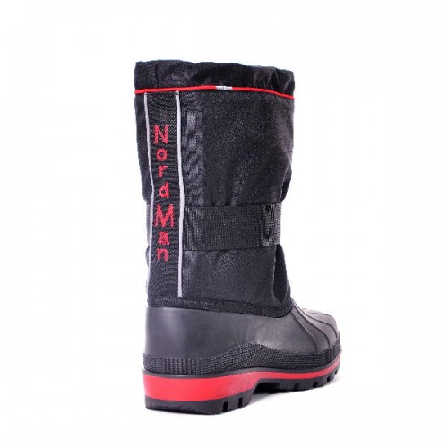 Удобная и теплая современная обувь для зимней охоты, рыбалки. Текстильный верх бахил изготавливается из прочной ткани RipStop , которая отличается высокой степенью водонепроницаемости, прочности и устойчивости к механическим воздействиям. На задней части обуви имеются светоотражающие ленты, благодаря чему охотник в такой обуви будет более заметным на дороге в темное время суток. Галоша бахил выполнена из морозоустойчивого материала тэрмоэластопласт ТЭП методом трехкомпонентного литья, которое обеспечивает улучшенные теплоизоляционные и амортизирующие характеристики. На подошве имеются шипы противоскольжения, благодаря которым удобно ходить по льду и другой скользкой поверхности. Дополнительное утепление дает многослойный вкладыш, более современный, удобный, износоустойчивый по сравнению с суконным вкладышем. Вкладыш не только отлично сохраняют тепло и поддерживают комфортный температурный режим даже при сильных морозах, но и обладают влагоотводящими свойствами, благородя чему конденсат выводится на поверхность галоши, а ноги всегда остаются сухими и не замерзают. Температура использования бахил Nordman New Red со вкладышами до -50 С. Структура вкладыша представлена несколькими слоями:1. Мягкий мех с использованием натуральной шерсти (не менее 50%); 2. Нетканое полотно с натуральными волокнами льна и шерсти –сохраняет тепло; 3. Фольгированное полотно – отражает тепло внутрь вкладыша, создает эффект «термоса»; 4. Поролон – обеспечивает дополнительную термоизоляцию; 5. Полиэфирная сетка – обеспечивает защиту от истирания. Дополнительно вставкой из винитола усилена пяточная часть.