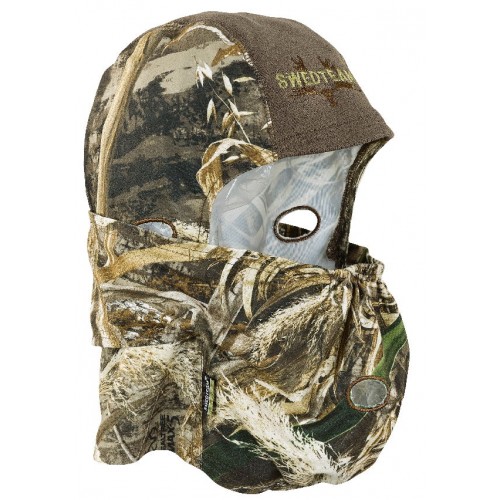 Балаклава закрывает голову целиком, имеются небольшие прорези для глаз и рта. Расцветка позволит слиться с природой, что, несомненно, очень удобно при охоте. Балаклаву можно использовать как подшлемник под шапку или капюшон.