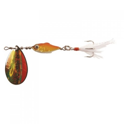 Блесна отлично подходит для ловли щуки и окуня. Хорошо работает на глубине. Сердечник представляет собой рыбку; лепесток с голографическим покрытием, создающим на воде блики, привлекающие рыбу. Имеется белое перо с блестящими волокнами Accept Flash.