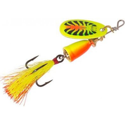 Блесна Blue Fox Vibrax Foxtail - блесна с шумовым эффектом и антизакручивающими свойствами, рассчитаные на дальний заброс. Популярность этой приманки объясняется ее удачным устройством, включающей колокол из латуни, и противозакручивающей втулки, расположенной внутри него. Такая конструкция при проводке издает дополнительные колебания на низких частотах, что значительно добавляет привлекательности для рыбы. Лепесток приманки немного вытянут, как у большинства блесен, которые выпускает Blue Fox. Вращалки Vibrax отлично себя ведут во время заброса и могут использоваться без применения лишних грузов