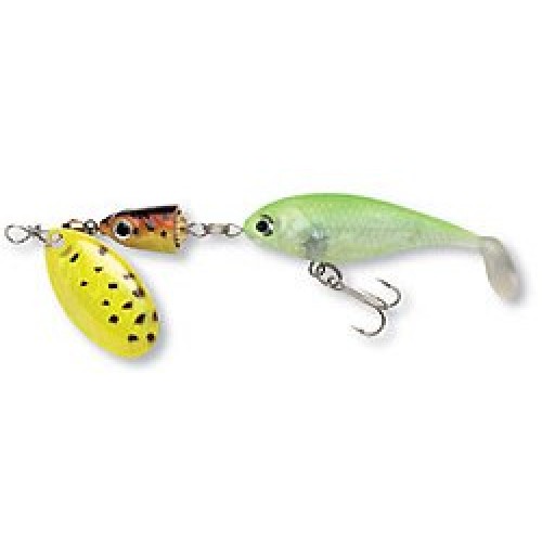 Vibrax DoubleHeader Мягкое тело. Мягкое тело приманки выглядит естественным для хищника. К приманке прилагается 2 сменных тела. Сердечник вращающейся блесны. Хромированный корпус из цинка. Лазерное голографическое и красочное покрытие. Глаз, похожий на настоящий. Стержень. Нержавеющая сталь. Петли формируются в специальных зажимах. Латунная штамповка, лазерная голография. Окраска или красочная печать деталей. Латунная шестеренка свободно вращается и издает звук при соприкосновении с сердечником. Крючок VMC имеет острейшее жало с высокой проникающей способностью. Высокая прочность на разгиб.
