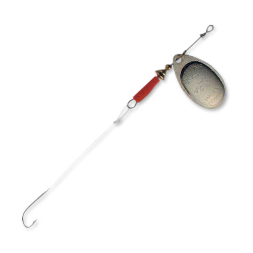 Отличительная особенность этой блесны - отсутствие утяжелителя, замененного красной пластиковой втулкой. При этом тройник также заменен одинарным крючком с поводком из лески.