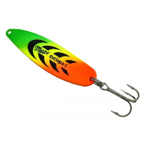 MEPPS SYCLOPS Hot блесна с очень яркой матовой окраской, дающей преимущество при ловле в темное время суток, на большой глубине и в мутной воде. С английского Hot переводится как "горячий". Нашим рыболовам эта блесна знакома и под французским названием SYCLOPS Fluo - "флуоресцентный", но как бы мы не переводили на русский язык название этой блесны, суть её остаётся неизменной - яркая, заметная, вызывающая вот основные синонимы этой блесны. Кроме того, Меппс в информационных материалах часто публикует фотографии погруженной в воду панели, на которой размещены клейма, окрашенные в цвета этой разновидности блесны мепс циклоп. Все они изменяются более или менее значительно, а некоторые вообще становятся неузнаваемы. Например, розовый (Pink) приобретает ярко-голубой оттенок. Вероятнее всего, на первое место надо поставить тщательное изучение особенностей каждого конкретного водоема, разумеется и не забывая при этом общие рекомендации.