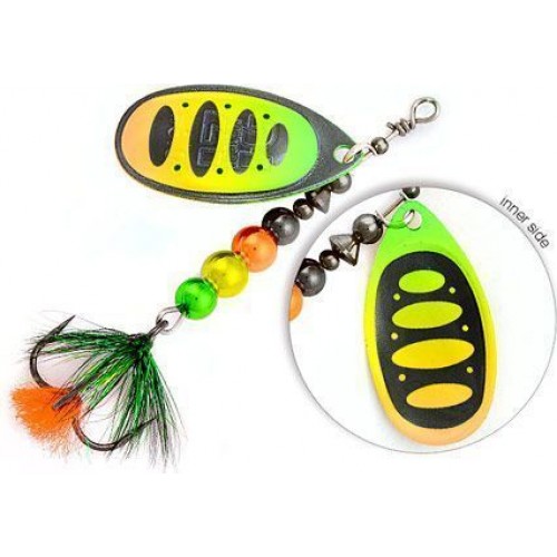 Конструктивно эту серию вращающихся блесен отличает несколько иное, чем у Synchrony строение сердечника. Он у Ball Concept наборный, состоящий из нескольких шариков разного диаметра. Именно за счет сердечника центр тяжести блесны несколько иной, он чуть смещен к задней части тела, что положительно сказывается на дальности и точности заброса. Кроме того, при проводке блесны в водной толще генерируются несколько иные колебания, влияющие на реакцию хищника. Что касается основного «рабочего элемента» блесны – лепестка, то он аналогичной с Synchrony формы, с такой же реверсивной раскраской, отклонение от оси на уровне 40-45 градусов, позволяющее использовать приманку как на течении, так и в стоячей воде. Острейший тройник оснащенный миниатюрной мушкой – завершающий штрих к портрету Ball Concept от Pontoon21.