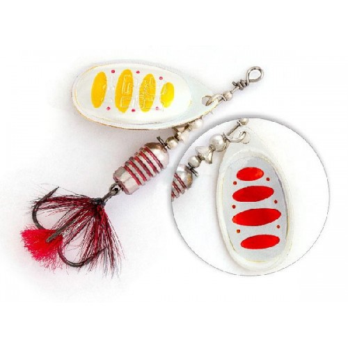 Лепесток блесны прежде всего отличается своим декором – он двусторонний и к тому же еще и реверсивный. При вращении лепестка удалось добиться оригинального эффекта, близкого к объемному изображению. Хищник видит мельтешащий провоцирующий рисунок лепестка под любым углом обзора. Это ли не повод для атаки?