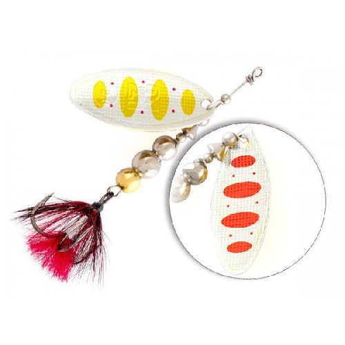 Trait представлена в широком размерном ряду. Семь типоразмеров от #00 до #5. Позволяет закрыть как потребности приверженцев ловли на ультралёгкие снасти, так и любителей тяжёлой весовой категории. Кстати. Trait #5 весит 38,4 грамма. Окраска лепестка реверсивная, это сильный раздражающий фактор для хищника. Тело блесны наборное, состоит из латунных шариков определённого размера и веса. Острый мощный тройник опушён мухой. А это ещё один привлекающий фактор, плюс стабилизация вертушки в горизонтальной плоскости за счёт сопротивления опушки.