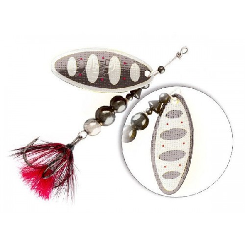 Trait представлена в широком размерном ряду. Семь типоразмеров от #00 до #5. Позволяет закрыть как потребности приверженцев ловли на ультралёгкие снасти, так и любителей тяжёлой весовой категории. Кстати. Trait #5 весит 38,4 грамма. Окраска лепестка реверсивная, это сильный раздражающий фактор для хищника. Тело блесны наборное, состоит из латунных шариков определённого размера и веса. Острый мощный тройник опушён мухой. А это ещё один привлекающий фактор, плюс стабилизация вертушки в горизонтальной плоскости за счёт сопротивления опушки.