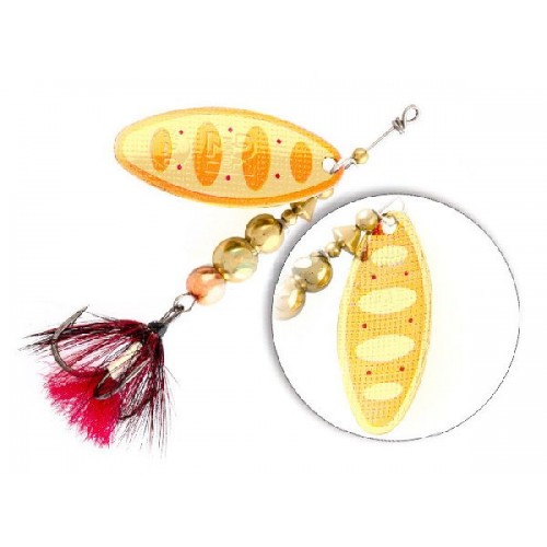 Trait представлена в широком размерном ряду. Семь типоразмеров от #00 до #5. Позволяет закрыть как потребности приверженцев ловли на ультралёгкие снасти, так и любителей тяжёлой весовой категории. Кстати. Trait #5 весит 38,4 грамма. Окраска лепестка реверсивная, это сильный раздражающий фактор для хищника. Тело блесны наборное, состоит из латунных шариков определённого размера и веса. Острый мощный тройник опушён мухой. А это ещё один привлекающий фактор, плюс стабилизация вертушки в горизонтальной плоскости за счёт сопротивления опушки.