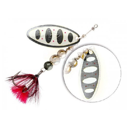 Trait представлена в широком размерном ряду. Семь типоразмеров от #00 до #5. Позволяет закрыть как потребности приверженцев ловли на ультралёгкие снасти, так и любителей тяжёлой весовой категории. Кстати. Trait #5 весит 38,4 грамма. Окраска лепестка реверсивная, это сильный раздражающий фактор для хищника. Тело блесны наборное, состоит из латунных шариков определённого размера и веса. Острый мощный тройник опушён мухой. А это ещё один привлекающий фактор, плюс стабилизация вертушки в горизонтальной плоскости за счёт сопротивления опушки.