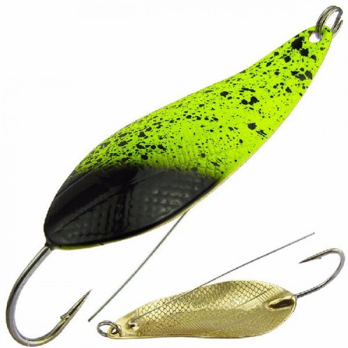 Благодаря различной толщине профиля имеет смещенный центр тяжести, что позволяет совершать блесне сложные волнообразные колебания. Используется при ловле на мелководье по траве.