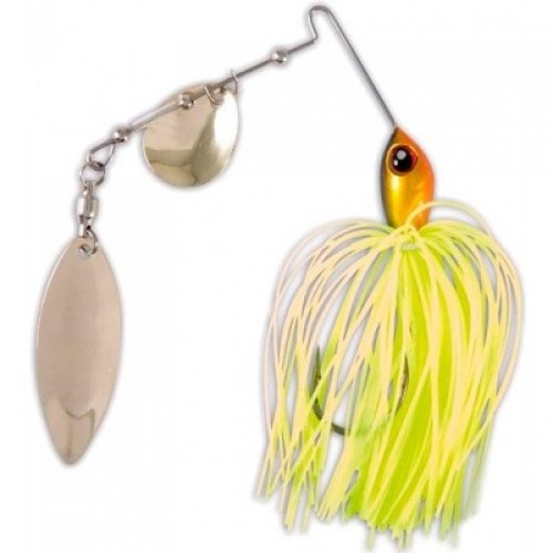 Вообще, спиннербейт ("spinner" - вращающаяся блесна, "bait" - наживка) - это предельно странный и, на первый взгляд, очень неуклюжий гибрид. Выглядит он обычно так. На примерно равных плечах проволочного уголка смонтированы: на одном плече - вращающийся лепесток, или лепестки, на другом - свинцовая головка, типа джиговой, с большим одинарным крючком в обрамлении прядей какой-нибудь мягкой "юбки". При проводке "неуклюжесть" пропадает, и приманка "оживает": тяжелая головка оказывается снизу, а лепестки - сверху. Лепестки, как им и положено, вращаются, пряди юбки колышутся, то собираясь вместе, то расходясь в стороны. Особо не преувеличивая, можно сказать, что спиннербейт - самая искусственная среди всех существующих искусственных спиннинговых приманок. Трудно даже представить, какой кормовой объект может хоть отдаленно напоминать хищной рыбе это "сооружение", тем не менее она его хватает, причем, иногда даже лучше, чем какие-либо другие спиннинговые приманки. Возможно, секрет действия спиннербейтов на рыбу заключается в сочетании множества различных эффектов: колебаний, звуковых, световых и цветовых импульсов, создаваемых вращением лепестков, движением "юбки" и вибрацией проволочной арматуры. Все это одновременно воспринимают органы зрения, слуха и боковой линии рыбы, и получившийся коктейль "бьет ей в голову", заставляя атаковать совершенно неестественную добычу. При этом атаки бывают, по непонятной причине, чаще направлены именно на головку с юбкой, а не на лепестки.