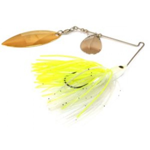 Вообще, спиннербейт ("spinner" - вращающаяся блесна, "bait" - наживка) - это предельно странный и, на первый взгляд, очень неуклюжий гибрид. Выглядит он обычно так. На примерно равных плечах проволочного уголка смонтированы: на одном плече - вращающийся лепесток, или лепестки, на другом - свинцовая головка, типа джиговой, с большим одинарным крючком в обрамлении прядей какой-нибудь мягкой "юбки". При проводке "неуклюжесть" пропадает, и приманка "оживает": тяжелая головка оказывается снизу, а лепестки - сверху. Лепестки, как им и положено, вращаются, пряди юбки колышутся, то собираясь вместе, то расходясь в стороны. Особо не преувеличивая, можно сказать, что спиннербейт - самая искусственная среди всех существующих искусственных спиннинговых приманок. Трудно даже представить, какой кормовой объект может хоть отдаленно напоминать хищной рыбе это "сооружение", тем не менее она его хватает, причем, иногда даже лучше, чем какие-либо другие спиннинговые приманки. Возможно, секрет действия спиннербейтов на рыбу заключается в сочетании множества различных эффектов: колебаний, звуковых, световых и цветовых импульсов, создаваемых вращением лепестков, движением "юбки" и вибрацией проволочной арматуры. Все это одновременно воспринимают органы зрения, слуха и боковой линии рыбы, и получившийся коктейль "бьет ей в голову", заставляя атаковать совершенно неестественную добычу. При этом атаки бывают, по непонятной причине, чаще направлены именно на головку с юбкой, а не на лепестки.