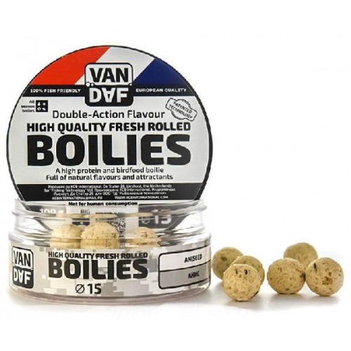 Бойлы Van Daf Анис - это продукт, который с огромнейшим успехом может применяться во все времена года, так как является всесезонным и рассчитан на ловлю при любой температуре. Они обладают сбалансированным составом с высокими питательными свойствами. В составе бойлов присутствуют натуральные ингредиенты, комплекс аминокислот с аттрактантами, масляная кислота и подсластители и другие вещества, отлично зарекомендовавшие себя, как максимально эффективные добавки.