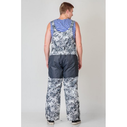 В конструкции этого изделия предусмотрены низки брюк со шлицами и с вставками на липучке для удобства. По низу подкладки полукомбинезона расположены защитные «юбочки» с эластичной тесьмой.