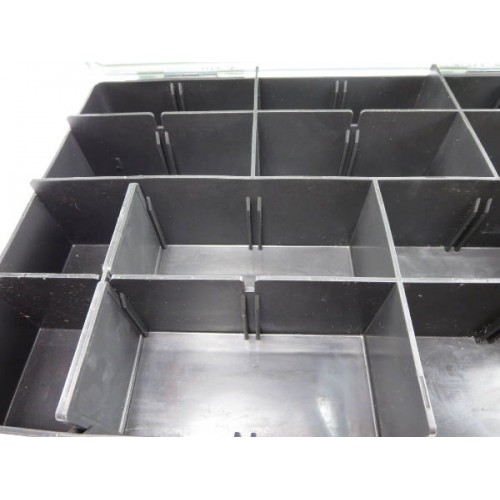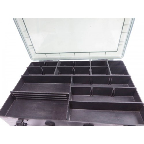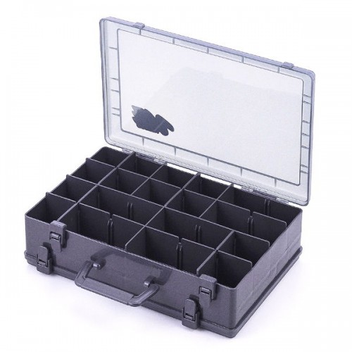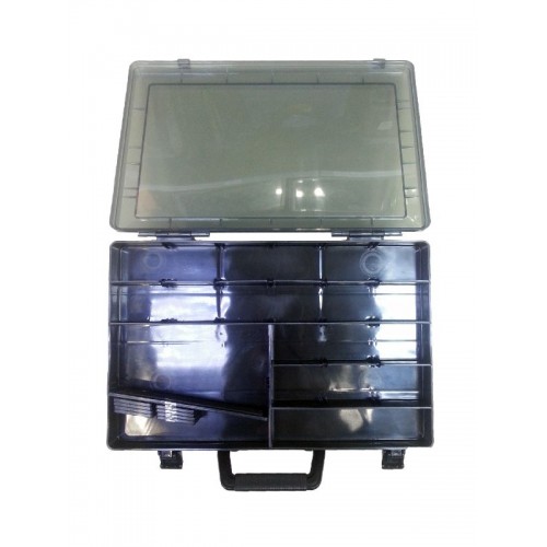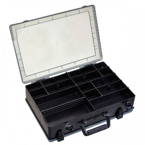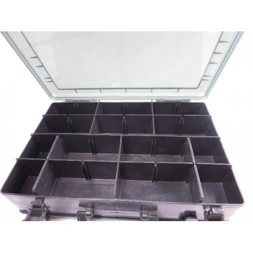 Уникальность такого чемодана обеспечивает его двухстороннее размещение секций. Обе стороны чемодана оснащены съемными перегородками что позволяет не только разместить большее количество оснастки, но и позволяет планировать рабочее пространство чемодана в зависимости от Ваших предпочтений. Обе крышки оборудованы надежными защелками и плотно прислоняются к перегородкам таким образом предотвращая смешивание содержимого. Удобная ручка позволяет без особых усилий транспортировать ящик в ручной поклаже. Глубина одного отделения 5,4 см, второго - 3,7 см. С одной стороны отсек имеет шесть постоянных отделений, с помощью четырех сдвоенных перегородок можно увеличить количество отделений до 15. С другой стороны отсек имеет десять постоянных отделений, с помощью четырех сдвоенных перегородок и одной длиной перегородки можно увеличить количество отделений до 18. Материал чемодана - ударопрочный сополимер Shock-resistant Copolymer , крышка чемодана - качественный полипропилен Polypropylene .