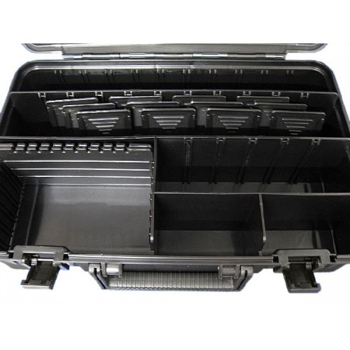 Versus VS-3055 - односторонний рыболовный чемодан-ящик. Размер и количество ячеек изменяется с помощью съёмных перегородок, что позволяет не только разместить большее количество оснастки, но и позволяет планировать рабочее пространство ящика в зависимости от Ваших предпочтений. Крышка оборудована надежными защелками и плотно прислоняется к перегородкам таким образом предотвращая смешивание содержимого. Удобная ручка позволяет без особых усилий транспортировать ящик в ручной поклаже. Чемодан изготовлен из ударопрочного сополимера Shock-resistant Copolymer , крышка и перегородки из пластика ABS ABS-пластик . Глубина отделения - 7,5 см