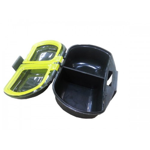Крышка профилированная, то есть имеет углубление. Оно позволяет разместить на крышке небольшое количество наживки или насадки. При активном клёве это позволяет не открывать коробку каждый раз, когда нужно поменять насадку или наживку, что существенно экономит драгоценное на рыбалке время.