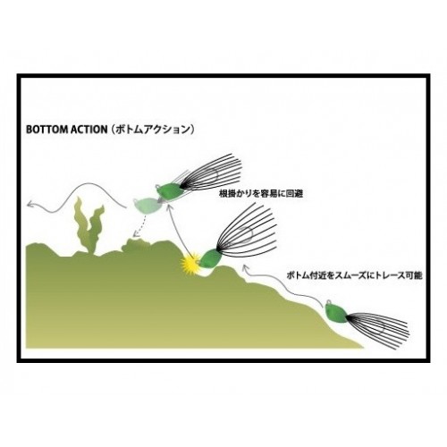 Приспособлена специально к рокфишингу. Тело из плавучего материала, помогает избегать зацепов, при этом позволяет рыбе легко заглотить крючок. Благодаря форме груза джиг-головки, при проводке образуются завихрения, которые придают более интересную игру приманке.