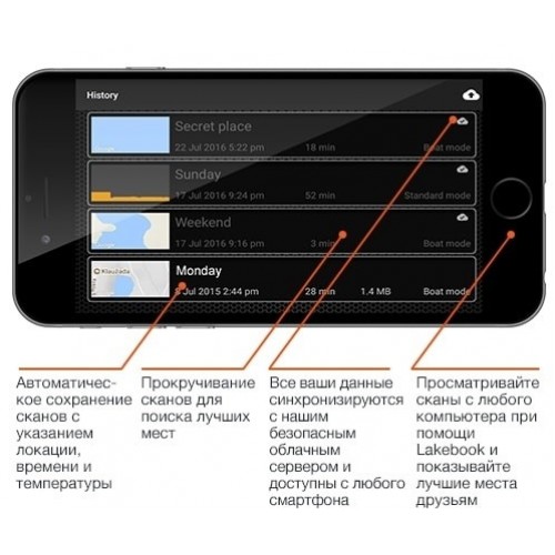 Детальный просмотр сканов на большом экране – вернулись домой с рыбалки? Самое время подробнее изучить места, в которых рыбачили. Войдите в Lakebook, чтобы иметь возможность просмотра любых карт и сканов с любого компьютера. Отмечайте места с наличием рыбы или растительности, или места, структуру которых вы изучали по карте — все метки дополняются GPS-координатами.