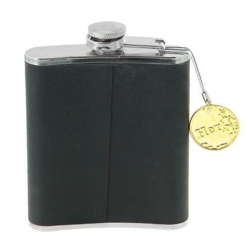 Металлическая фляжка объемом 210 мл с тиснением на кожанном обрамлении в виде медведя.
