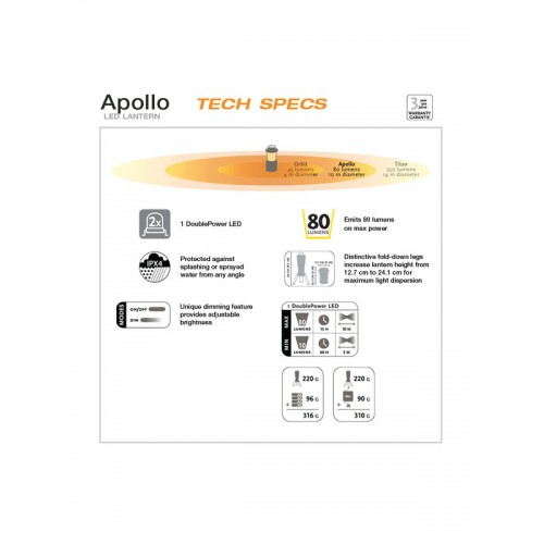 Яркий, не слепящий фонарь для кемпинга, бивуака и палатки. Продуманная конструкция позволяет как поставить фонарь на не ровную поверхность (фонарь оснащен тремя подпружиненными ножками с обрезиненным основанием), как и подвесить на стропу бивуачного тента или в палатке. В отличии от газовой лампы, использование фонаря Apollo в палатке полностью безопасно. Уникальная раздвижная конструкция не только экономит объём при перевозке, но и обеспечивает регулировку направления светового потока. В фонаре использован светодиод мощностью 3 Ватта с возможностью плавной регулировки яркости. Устройство работает на батареях 4AA или от аккумулятора из комплекта NRG (продается отдельно) и снабжено индикатором остаточного заряда.