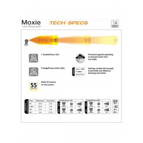 Налобный фонарик Moxie, выполненный на мощной и функциональной платформе Cosmo, отличается привлекательным дизайном. 1 светодиод типа DoublePower и два светодиода типа SinglePower обеспечивают максимальную мощность 55 люменов. Сверхкомпактная конструкция корпуса с расположенными в передней части тремя батарейками типа ААА Выбор одного из трех режимов (в том числе экономичного) осуществляется при помощи единственного переключателя. Наличие модуля памяти позволяет сохранять выбранный режим даже после выключения. Уровень водонепроницаемости - IPX4 (защита от брызг и струй воды, падающих под любым углом).