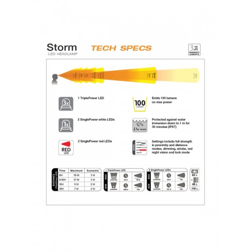 С помощью надёжного, водонепроницаемого налобного фонарика Black Diamond Storm мощностью 100 Люменов вы легко отыщете спусковые шлямбура или преодолеете сложный маршрут в самых неблагоприятных погодных условиях. В дополнение к универсальным ближнему, дальнему и мигающему режиму, имеется ночной режим, который обеспечивается двумя красными светодиодами. Переход в последний осуществляется без переключения на белый свет. Кроме этого данная модель имеет режим блокировки, исключающий самопроизвольное включение фонарика при хранении или транспортировке. 1 светодиод типа TriplePower, 2 "белых" и 2 "красных" светодиода типа SinglePower, максимальная мощность – 100 люменов. Переход в ночной режим (красный свет) осуществляется без переключения на белый свет. Плоский обтекаемый корпус, рассчитанный на 4 батарейки типа ААА. Доступны следующие режимы: дальний или ближний свет максимальной яркости, экономичный, мигающий, ночной, блокировка. Трехуровневый индикатор показывает уровень заряда батареек в течение трех секунд после включения фонарика. Уровень водонепроницаемости - IPX7 (допускается погружение в воду на глубину 1 м / 3.3 фута на 30 минут).