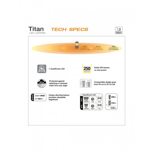 Благодаря светодиоду QuadPower со световым потоком 250 люмен кемпинговый фонарь Titan способен осветить площадь радиусом 14 метров и помочь в приготовлении пищи, подготовке снаряжения или в любом другом ночном занятии. Уникальная система регулировки яркости поможет подобрать необходимое освещение и сэкономить батареи, а складные полукольца позволят легко подвесить фонарь над головой. QuadPower диод со световым потоком 250 люмен и матовая колба дают яркий рассеянный свет. Система двойного рефлектора. Индикатор показывает уровень разряда 4 батарей типа D. Уникальная плавная регулировка яркости. Компактно собирается для транспортировки до 200 мм, высота в разобранном виде 250 мм. Складное кольцо для подвешивания.