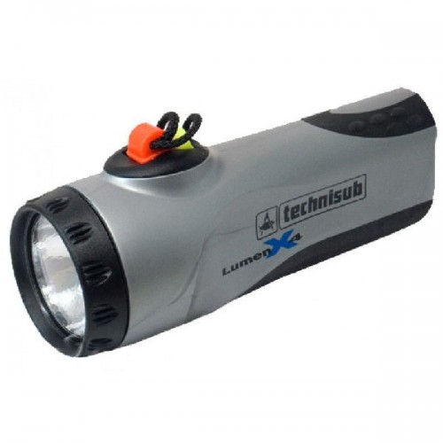 Фонарь Technisub Люмен X4 silver. Экстраординарный и привлекательный внешний вид, несравненные технические характеристики - это новые фонари Lumen X4, ставшие воплощением колоссального опыта Technisub в области подводных осветительных систем. Фонари Lumen X4 характеризует уникальный инновационный дизайн. Они имеют частично прорезиненный корпус, что позволяет легче и надежнее удерживать фонарь в руке. Эти модели разработаны специально для размещения в кармане компенсатора плавучести. Благодаря новому скользящему переключателю, фонари легко включать и выключать одной рукой. Вы можете немедленно включить свет, не ослабляя захват фонаря, даже если вы ныряете в перчатках. Галогеновая лампа обеспечивает мощный и концентрированный ярко-белый световой пучок, что позволяет с легкостью освещать подводные расщелины и гроты. Фонари имеют мультизеркальный рефлектор, что, благодаря большей отражающей поверхности, гарантирует максимальную световую отдачу и абсолютно равномерное распределение света. Батарейный блок был полностью переработан, чтобы обеспечивать быструю смену батарей без необходимости касаться лампы фонаря. Все, что от вас требуется, это вставить батареи, соблюдая их правильную полярность. Большим преимуществом являются небольшие размеры и высокая степень автономности фонарей Lumen X4, благодаря чему они становятся не только идеальными резервными источниками света, но и помощниками во время ночных погружений в тропиках.