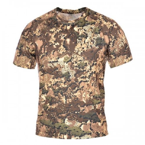 Футболка с коротким рукавом и круглой горловиной из облегчённого термополотна. Быстросохнущий материал с микротекстурой отлично отводит влагу и сохраняет ощущение комфорта. Рукав-реглан обеспечивает максимальную свободу движений. Имеет плоские швы. Модель представлена в камуфляже "Лес" с технологией OPTICAL ILLUSION .