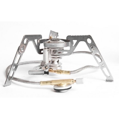 Газовая горелка Kovea Moonwalker Stove Camp-4 KB-0211G-L "0211L" — со шлангом, оснащенная системой предварительного подогрева газа (Anti-Flare System) и пьезоподжигом. Специальная сетка в головке горелки предотвращает задувание пламени ветром. Выпускается в двух модификациях с разной длиной шланга — 30 см (KB-0211G) и 50 см (KB-0211L). Длинный шланг позволяет при низких температурах, когда газ начинает замерзать, держать баллон в тепле, например в спальнике или на крышке кастрюли.