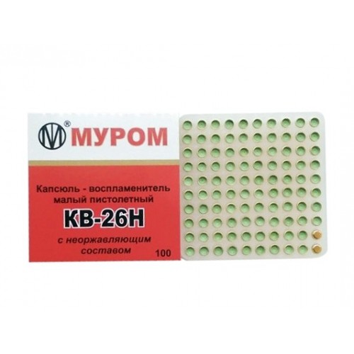 Капсуль системы Бердана малый пистолетный КВ-26Н (КВ26Н) Производство АО «Муромский приборостроительный завод». Пластиковая заводская упаковка по 100 штук. Используется в патронах калибра 10х28, а так же во всей линейке отечественных гильз 9х18, 9х19, 7.62х25, 5.45х39, 7.62х38.