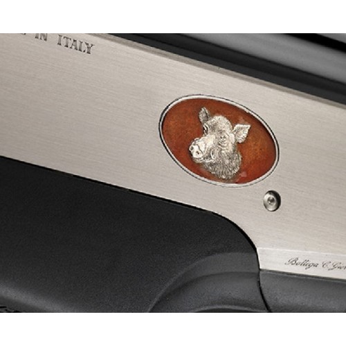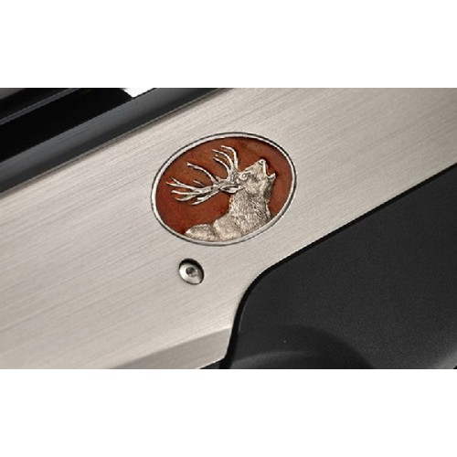 Карабин уникальный по стилю и элегантности. Ствольная коробка украшена эмалированными медальонами с сюжетной гравировкой, передающей мощь кабана и величие оленя. Отделка высокого класса, полировка никелированной ствольной коробки, отменное качество комлевого ореха, пропитанного маслом.
