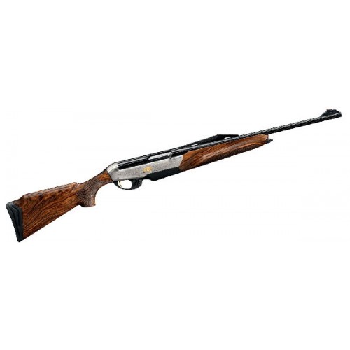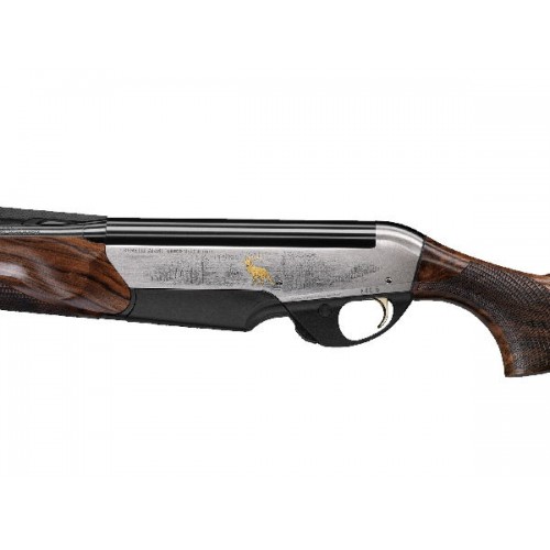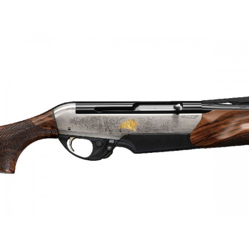 На правой стороне ствольной коробки этого самозарядного нарезного оружия Benelli 308Win калибра изображён стремительно бегущий кабан, а на левой – благородный олень, настороженно всматривающийся вглубь леса. Позолоченные фигуры подчёркивают элегантность и утончённость отделки карабина Бенелли.