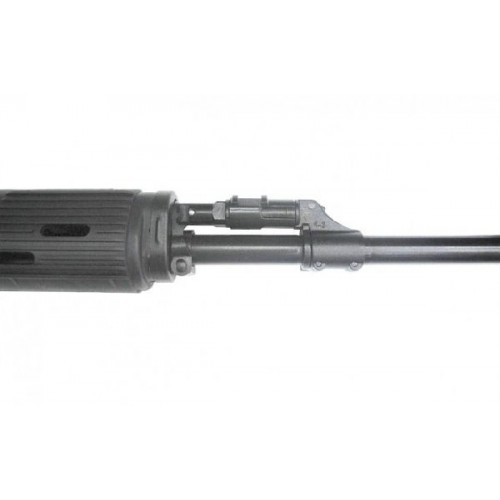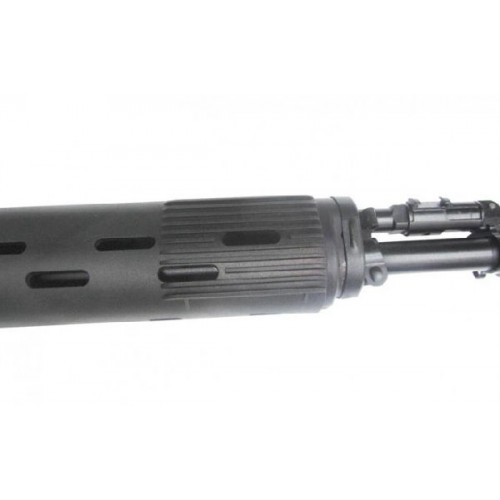На стволе установлен пламегаситель, для уменьшения подброса ствола. Ствольная коробка оснащена боковой планкой, для установки оптики.