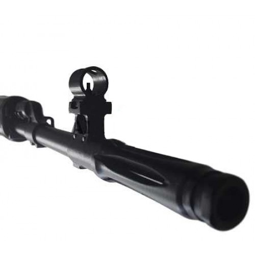Карабин Тигр 7,62 исполнение 05 выполнен по типу винтовки СВД и оснащен деревянным ламинированным прикладом характерной скелетной конструкции и длинным щелевым пламегасителем на стволе. Щека на прикладе съемная. Цевье выполнено из ламинированного дерева. Для установки оптических прицелов на ствольной коробке имеется боковая планка, кроме того, в конструкции предусмотрены открытые прицельные приспособления (мушка и целик с разметкой до 300 метров).