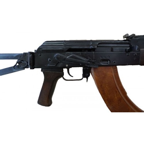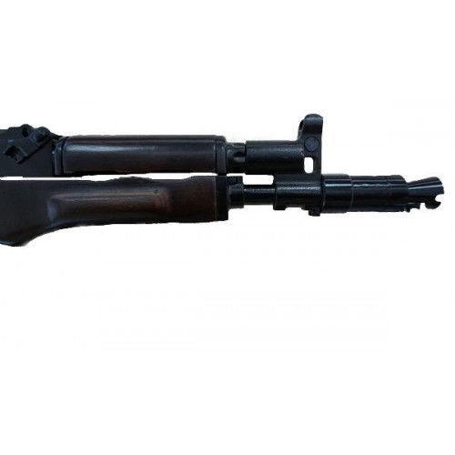 Имеет складной рамочный приклад (система складывания радаильно вниз типа АКМС), дульное устройство по типу АКМ.