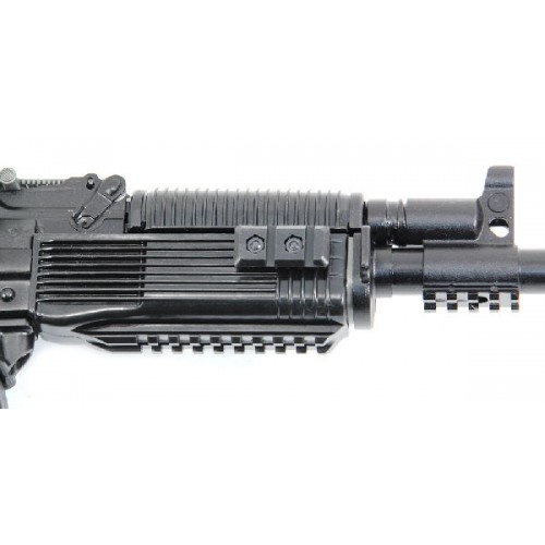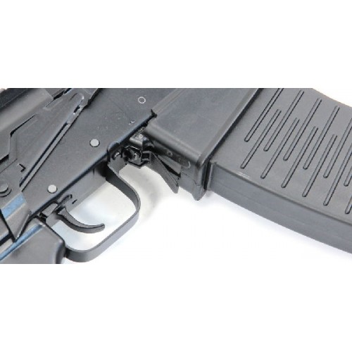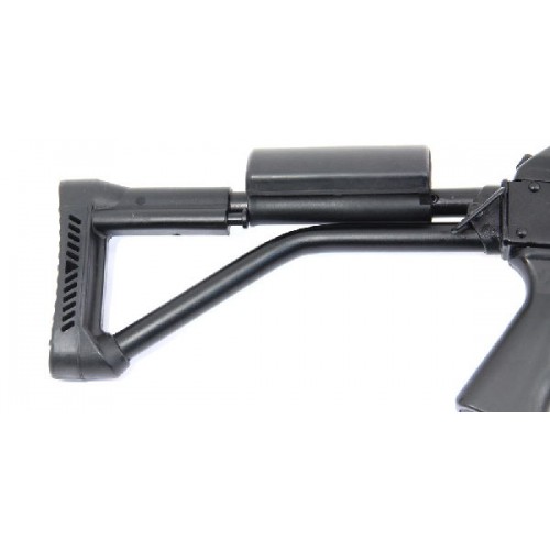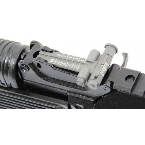 Оснащен съемным пламегаситем, установленным на дульной части ствола, и механизмом блокировки спускового крючка.