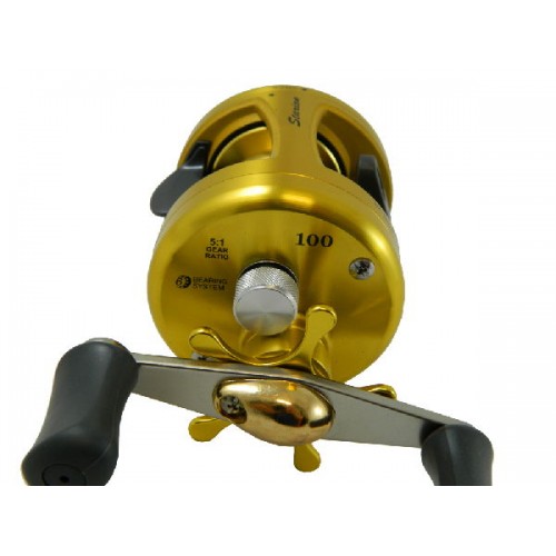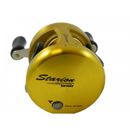 Banax Starion 100 Gold - классический мультипликатор. Механизм катушки состоит из шести подшипников, пять шариковых и один роликовый. Катушка оснащена системами мгновенного антиреверса и механического подтормаживания. Фрикционный тормоз имеет шесть дисков. Шестерни механизма изготовлены из латуни. Во время заброса лесоукладыватель отключается. Модель золотистого цвета, подходит под правую руку.