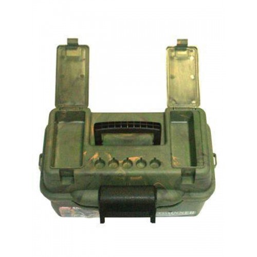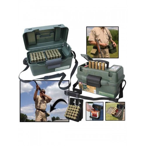 Кейс с ремнем для хранения и транспортировки патронов 12-16 калибров. Рассчитан на 100 патронов. Прочный кейс из АBS пластика с удобной складывающейся ручкой для переноски, надежной защелкой и нейлоновым ремнем для переноски через плечо. Два закрывающихся небольших отделения, а также 5 ячеек под 5 патронов на верхней части (крышке) ящика. Внутри кейса четыре пластиковых блока на 25 патронов каждый, а также специальная клипса для крепления блока или отдельной пачки патронов на поясной ремень.