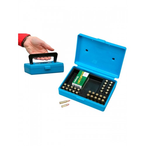 Кейс MTM для патронов - коробка из ударопрочного пластика (полипропилена), для хранения и транспортировки 100/180 патронов к охотничьему карабину или спортивной винтовке. Для удобства переноски оснащена складной пластиковой рукоятью. Спецификой модели является наличие вынимающейся кассеты, в ячейках которой патроны могут жестко фиксироваться пулями вниз. Это исключит деформацию носика пули при тряске багажа в транспорте, а значит - сохранит точность. При длительном хранении или использовании различных типов снарядов (для их оперативной идентификации) - можно вставлять патроны в ячейки и пулей вверх. Интегрированная «петелька», образованная перегибом пластика, обеспечивает 1 000 000 циклов по открытию-закрытию коробки или 10 лет исправной работы (заявление производителя). Тугая защелка, исключает возможность случайного открытия бокса и высыпания патронов.