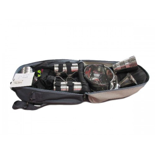 Удобный кейс-сумка с набором посуды для отдыха на природе отлично подойдет для любителей времяпрепровождения на свежем воздухе. Главное достоинство кейса - компактность. В него легко вмещается комплект, рассчитанный на шесть персон. Набор включает миски, тарелки, столовые приборы, кружки, стаканы и стопки. Вся посуда выполнена из нержавеющей стали.