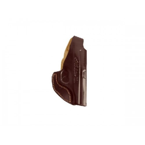 Кобура оснащена универсальной шлевкой. С ее помощью модель надежно крепится к поясу. Дульный срез пистолета и его рукоятка открыты. Ремешок с кнопкой фиксирует оружие в кобуре. Металлический ускоритель помогает, при необходимости, быстро его извлечь.
