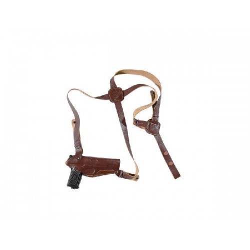 Модель подойдет тем, кто предпочитает плечевой способ ношения кобуры. Два приклепанных ушка, расположенных на корпусе, крепятся к подвесной системе. Ее ремешки можно регулировать по длине. А боковая пристежка создана для крепления к поясному ремню. Это помогает правильно распределить нагрузку.